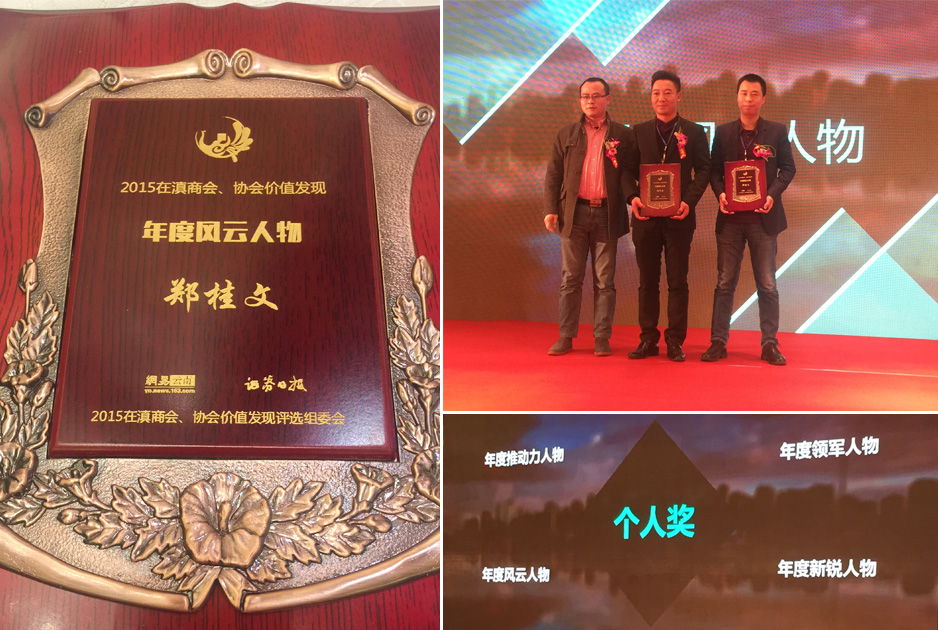 在“2015年在滇商會(huì)協(xié)會(huì)價(jià)值發(fā)現(xiàn)”活動(dòng)中,經(jīng)過(guò)在滇40余家商會(huì)、協(xié)會(huì)及專家組的評(píng)選,云南天度集團(tuán)董事長(zhǎng)鄭桂文榮獲“年度風(fēng)云人物”稱號(hào)。