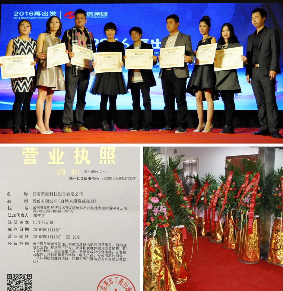 2016年1月28日,云南天度集團董事長鄭桂文向所有獲得股份獎勵的員工頒發(fā)了《股權證書》,并將所有股東、董事、監(jiān)事提交到云南省工商行政管理局進行了正式登記。