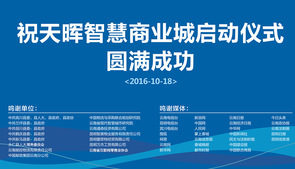 2016年10月18日,由云南天暉投資有限公司、云南天度投資集團有限公司和云南天暉城經(jīng)營管理有限公司聯(lián)合推出的“天暉智慧商業(yè)城”在大理賓川正式啟動。2017年1月19日,天暉城O2O眾創(chuàng)空間落戶賓川,大理州委常委、賓川縣委岳黎松書記、縣政府楊澤亮縣長、縣人大張成良主任、縣政協(xié)文慧君主席等相關(guān)領(lǐng)導(dǎo)及縣各部委辦局負責(zé)人參加了本次活動。
