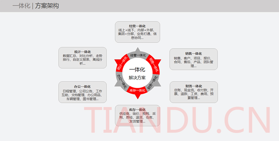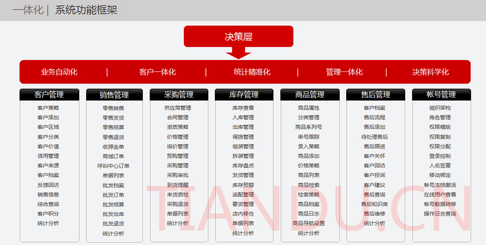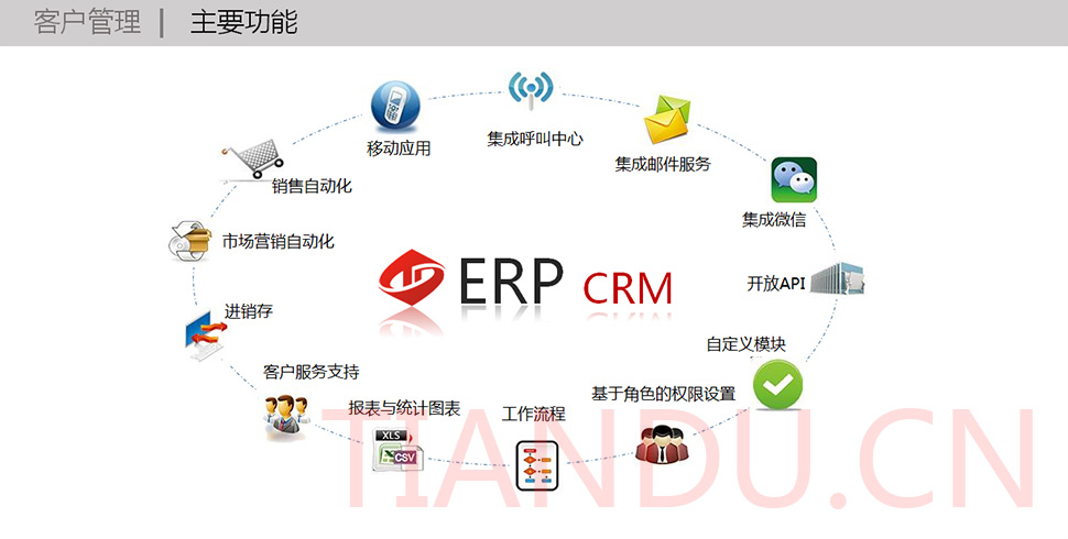 天度科技互聯(lián)研究院(博士后科研工作站)、天度軟件系統(tǒng)有限公司、天度科技股份有限公司合力近400人專業(yè)研發(fā)團隊,結合自身11年電子商務運營經驗,全力打造TDMALL電商ERP系統(tǒng):整合電商網站平臺(PC版、觸屏版、微信版、APP版)、ERP企業(yè)資源管理系統(tǒng)、CRM客戶關系管理系統(tǒng)、財務管理系統(tǒng)、OA辦公系統(tǒng)和Call Center呼叫中心等系統(tǒng),實現(xiàn)前端電商平臺及后端強大支撐系統(tǒng)的管理。