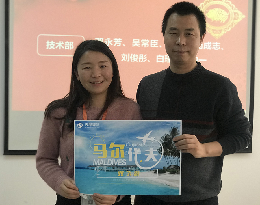 天度網(wǎng)絡公司今年拿出數(shù)十萬現(xiàn)金紅包,由楊總和陸總進行發(fā)放(集團每個公司的獎勵和獎金發(fā)放都是單獨進行,據(jù)悉,集團今年不管是獎金總額、還是獎金單額都超過往年,總額超過7位數(shù))。公司對2018年度各部門優(yōu)秀同事進行了表彰,并發(fā)對各個獎項進行發(fā)放,同時鄭董事長現(xiàn)場抽取了“馬爾代夫帶薪休假旅游”的名額。