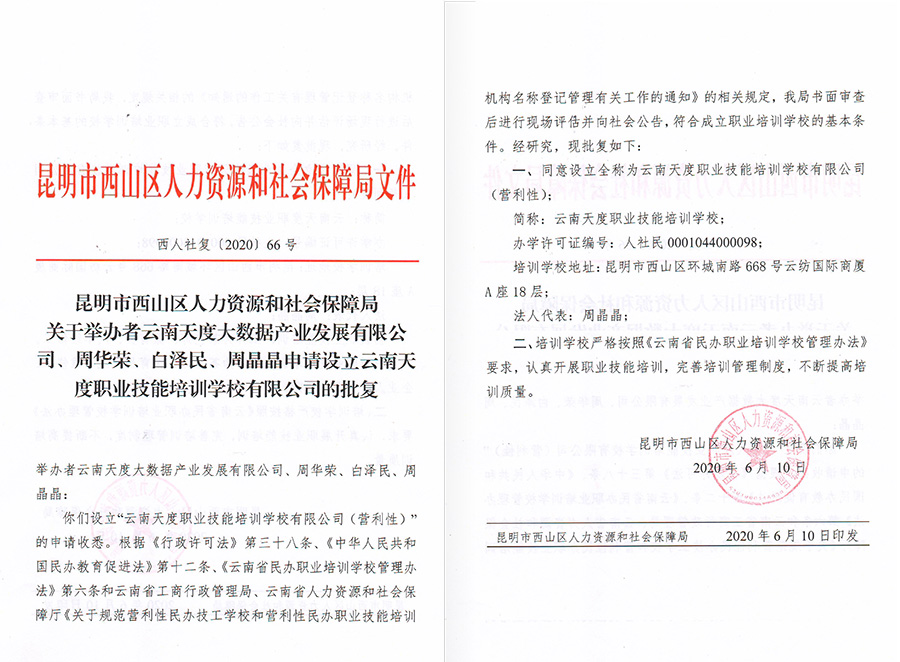 云南天度職業(yè)技能培訓(xùn)學(xué)校獲批成立,并取得《民辦學(xué)校辦學(xué)許可證》,免費(fèi)電商培訓(xùn)、網(wǎng)絡(luò)直播培訓(xùn)、企業(yè)職業(yè)技能提升培訓(xùn)等業(yè)務(wù)板塊正式啟動(dòng)