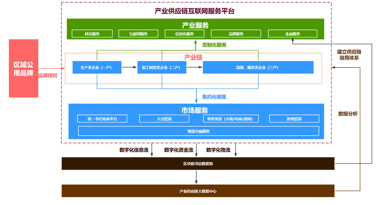 數(shù)字化供應(yīng)鏈服務(wù)平臺(tái)應(yīng)立足區(qū)域傳統(tǒng)產(chǎn)業(yè)、優(yōu)勢(shì)產(chǎn)業(yè)及重點(diǎn)支柱產(chǎn)業(yè),將電子商務(wù)將與發(fā)展需求充分結(jié)合,建立線上線下一體化的服務(wù)體系。平臺(tái)將區(qū)域品牌化體系建設(shè)為產(chǎn)業(yè)標(biāo)準(zhǔn)入口,服務(wù)于供應(yīng)鏈內(nèi)各企業(yè)主體,貫穿產(chǎn)業(yè)鏈從生產(chǎn)端、加工制造端、流通端全鏈條,以提升供應(yīng)鏈各主體協(xié)同效率。同時(shí),平臺(tái)以數(shù)字化為核心手段及時(shí)獲取供應(yīng)鏈信息流、物流、資金流等數(shù)據(jù),并基于區(qū)塊鏈技術(shù)建立一套產(chǎn)業(yè)可信數(shù)據(jù)池,應(yīng)用大數(shù)據(jù)分析技術(shù)對(duì)供應(yīng)鏈進(jìn)行動(dòng)態(tài)分析,最終實(shí)現(xiàn)智慧化供應(yīng)鏈系統(tǒng),成為基于數(shù)字化供應(yīng)鏈的集約化、智能化、創(chuàng)新性的開(kāi)放式產(chǎn)業(yè)生態(tài)平臺(tái),以市場(chǎng)化、數(shù)據(jù)化、智慧化的運(yùn)營(yíng)方式促進(jìn)產(chǎn)業(yè)升級(jí),創(chuàng)造價(jià)值與財(cái)富。